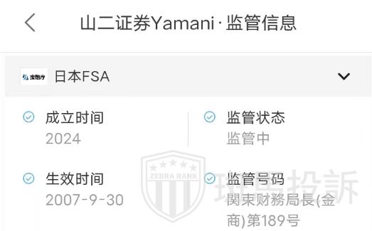 山二证券Yamani受日本FSA授权并监管,许可证号为関束财務局長(金商)第189号,FSA属于正规的外汇牌照,但市场有风险,投资者仍需谨慎选择。
