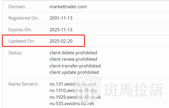 虽然官网域名(markettrader.com)注册时间为 2001 年 11 月 13 日,但根据官网内容、监管披露以及平台上线信息来看,该平台的品牌形象、内容架构和服务信息均为近期更新,域名最近一次更新时间为 2025 年 2 月 20 日。这提示我们: