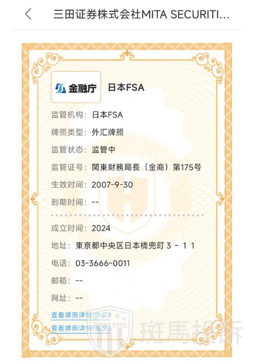 三田证券株式会社平台受日本FSA监管,取得関東財務局長(金商)第175号的外汇牌照,属于比较正规的监管,可以有效保障投资者的资金安全。