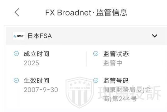 FX Broadnet受日本FSA授权并监管,许可证号为関東財務局長(金商)第244号,FSA属于正规的外汇牌照,但市场有风险,投资者仍需谨慎选择。