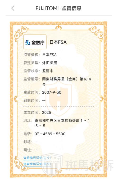 FUJITOMI平台受日本FSA监管,取得関東財務局長(金商)第1614号的外汇牌照。