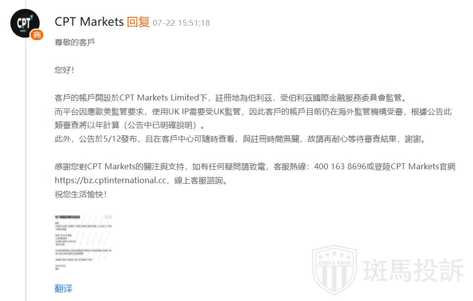 7/22,CPT平台方回复如下:客戶的帳戶開設於,註冊地為伯利茲,受伯利茲國際金融服務委員會監管。而平台因應歐美監管要求,使用UK IP需要受UK監管,因此客戶的帳戶目前仍在海外監管機構受審,根據公告此類審查將以年計算(公告中已明確說明)。此外,公告於5/12發布,且在客戶中心可隨時查看,與註冊時間無關,故請再耐心等待審查結果,謝謝。