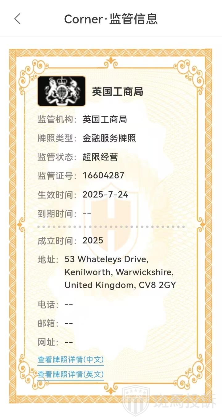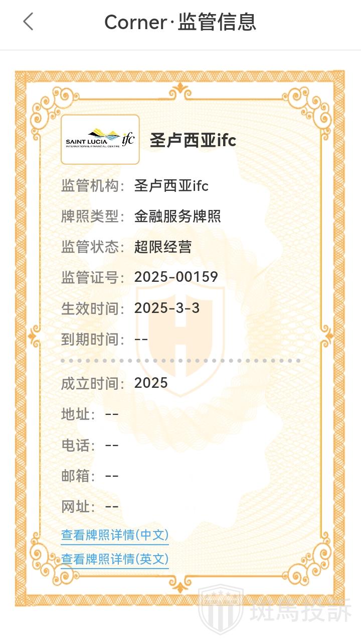 Corner平台官网称在圣卢西亚注册,持有交易商许可证,编号为:2025-00159;还在英格兰和威尔士注册,公司编号:16604287。经查询,该公司确实持有这两个牌照,但圣卢西亚和英格兰和威尔士没有监管外汇交易的权利,这对投资者来说还是有一定潜在风险的,希望投资者能引起警惕。