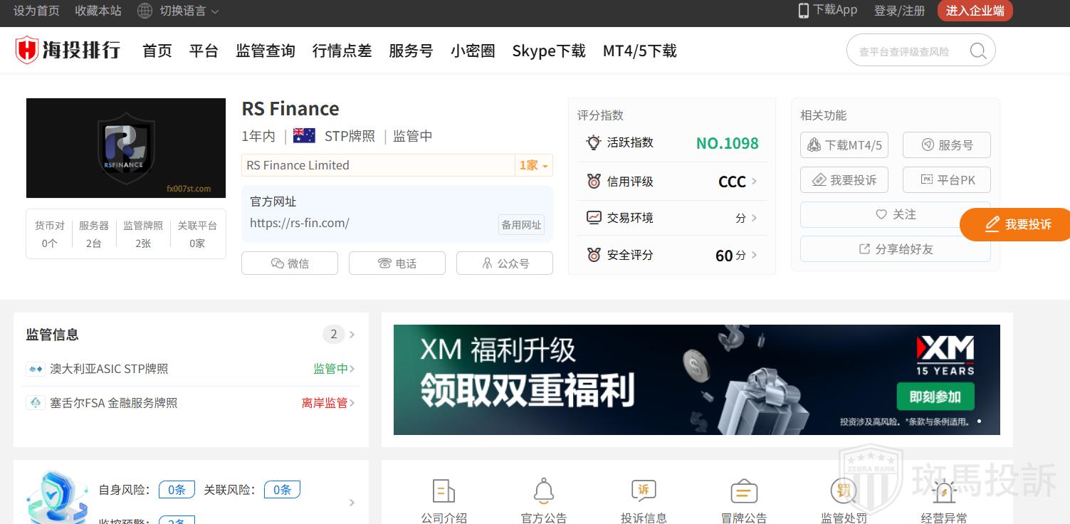RS Finance平台目前在斑马投诉未收到相关投诉。