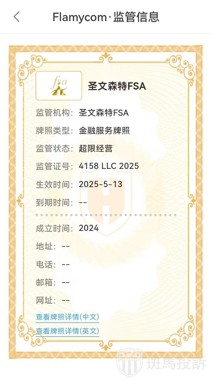 Flamycom平台官网称在圣文森特和格林纳丁斯注册,持有交易商许可证,编号为:4158 LLC 2025。经查询,该公司确实持该牌照,但圣文森特和格林纳丁斯没有监管外汇交易的权利,这对投资者来说还是有一定潜在风险的,希望投资者能引起警惕。