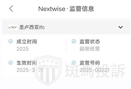 Nextwise受圣卢西亚ifc授权并监管,监管证号为2025-00221,Nextwise平台属于超限经营,监管相对宽松,对投资者的保护力度较弱,投资者需谨慎选择。