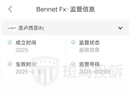 Bennet Fx受圣卢西亚ifc授权并监管,监管证号为2025-00288,Bennet Fx平台属于超限经营,监管相对宽松,对投资者的保护力度较弱,投资者需谨慎选择。