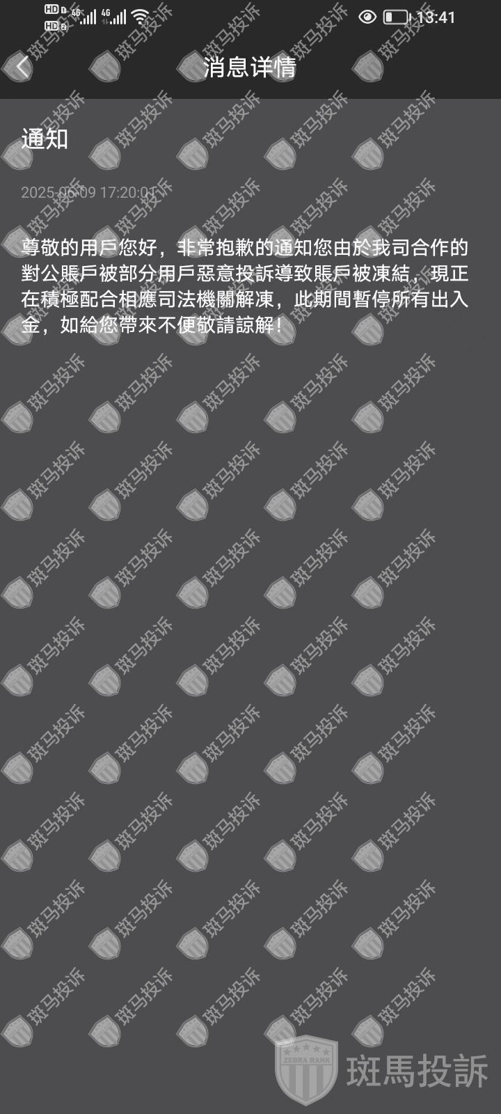 6月9日,收到了平台发来的一则消息。消息中称:“尊敬的用户您好,非常抱歉的通知您由於我司合作的對公賬戶被部分用戶惡意投訴導致賬戶被凍結,现正在積極配合相應司法機關解凍,此期間暂停所有出入金,如給您带來不便敬請諒解。”