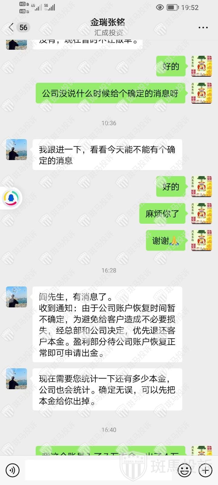 该投资者多次联系客户经理,希望能够得到一个合理的解释和解决方案。然而,客户经理的回复却让他感到无奈:“由于公司账户恢复时间暂不确定,为避免给客户造成不必要损失,经总部和公司决定,优先退还客户本金。盈利部分待公司账户恢复正常即可申请出金。”