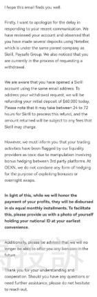 A某称,后面交易后盈利了大概46000美金(后面附上当时的交易交割单),盈利后有尝试出金未成功,平台给出的原因是违规交易,这个过程不详细说了,反正我全是手工单,后续经过沟通,与他们达成了出金协议,先出6万美金本金,后面利润按每个月6000美金的额度支出会(附上当时他们的邮件回复)