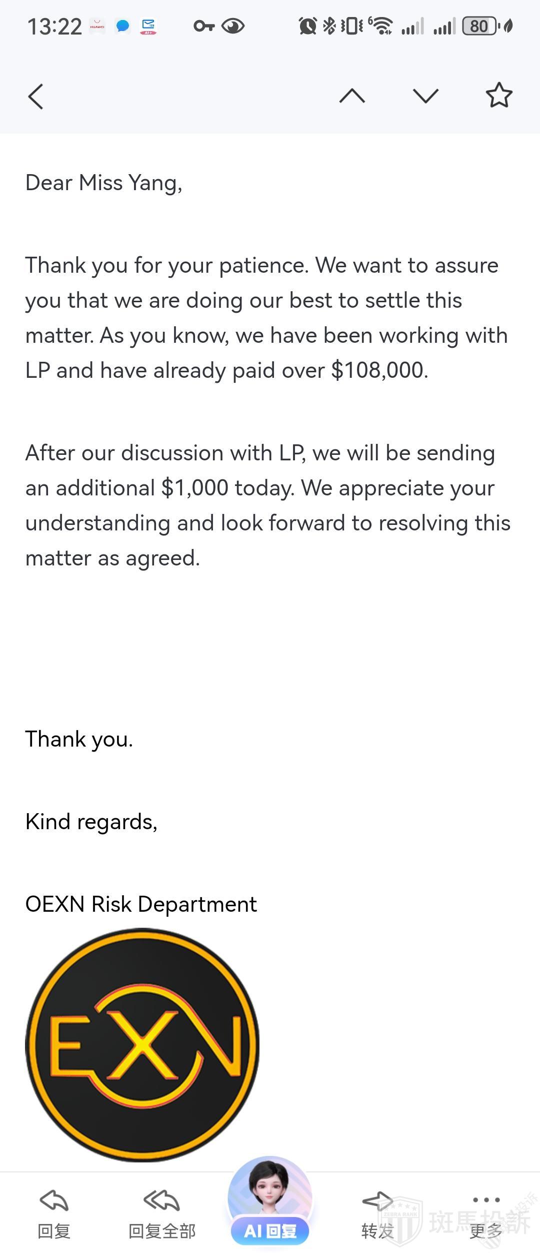 OXEN邮件回复:感谢您的耐心等待。我们想向您保证,我们正在尽一切努力来解决这个问题。正如您所知,我们一直在与LP合作,并已支付超过108,000美元。在与LP进行讨论后,我们将于今日再追加1,000美元。我们感谢您的理解,并期待按照约定解决此问题。