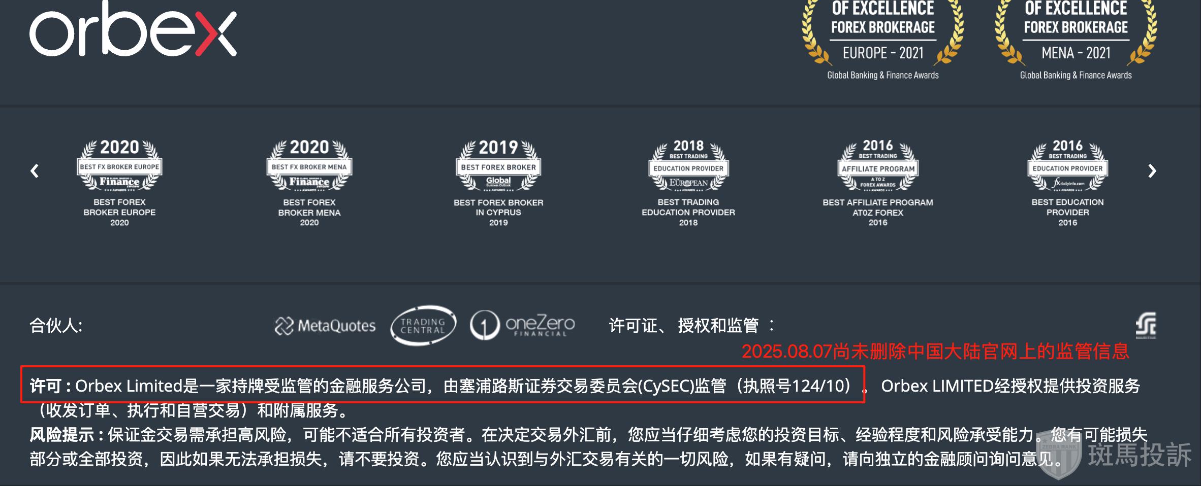 值得注意的是,尽管Orbex已经决定退出欧盟市场,但其在中国市场的官网上,目前仍展示着CySEC监管的信息(执照号 124/10)。然而,据相关消息显示,该牌照已经失效将近一个月。这一情况可能会给投资者带来一定的误导。因此,投资者需要特别注意自己的开户地址。如果是因为宣传CySEC监管或者账户开立在塞浦路斯实体下,那么投资者就需要尽快做好资金退出的安排,并考虑选择该平台其他监管实体进行存款,以确保资金的安全和合规性。