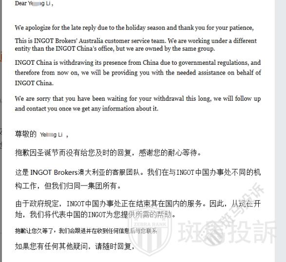 对此投诉,斑马第一时间将投诉信息反馈到了INGOT平台,并留下了联系方式,以便平台及时与我们沟通。截至发稿时,我们尚未收到平台的正式回应。我们已将此情况告知平台,并邀请平台就用户反映的问题进行说明或提供其立场。平台如有回应,我们将及时更新信息。我们在此呼吁平台积极回应用户的关切,并对相关情况进行说明。我们也欢迎INGOT平台与我们联系,提供其对该事件的解释和证据。斑马投诉平台致力于为消费者提供一个表达诉求的渠道。