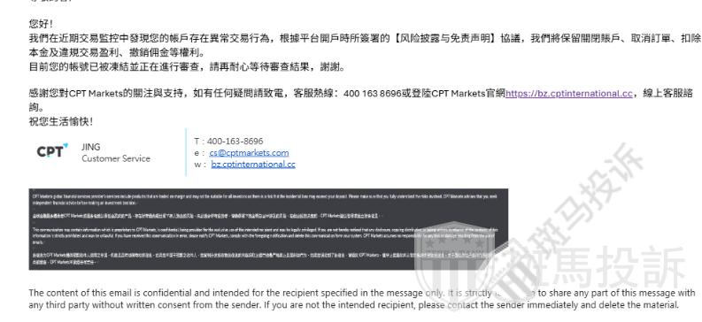 对此投诉,斑马第一时间将投诉信息反馈到了CPT平台,平台方回复如下:我們在近期交易監控中發現客戶的帳戶存在異常交易行為,根據平台開戶時所簽署的【风险披露与免责声明】協議,我們將保留關閉賬戶、取消訂單、扣除本金及違規交易盈利、撤銷佣金等權利。目前客戶的帳號已被凍結並正在進行審查,審查時間預計3-4周,請再耐心等待結果,謝謝。