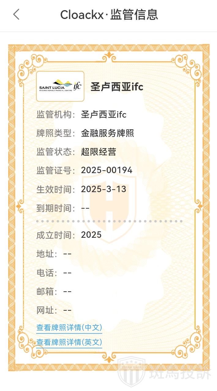 Cloackx平台官网称在圣卢西亚注册成立,受圣卢西亚ifc监管,持有交易商许可证,编号为: 2025-00194。经查询,该公司确实持该牌照,但圣卢西亚ifc没有监管外汇交易的权利,这对投资者来说还是有一定潜在风险的,希望投资者能引起警惕。