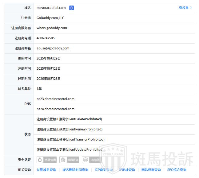 这家平台叫Mevora Capital,成立于2025年,全球活跃指数5748名,目前无监管,不能做外汇保证金交易,风险扫描显示1条风险,投资者资金安全无保障。