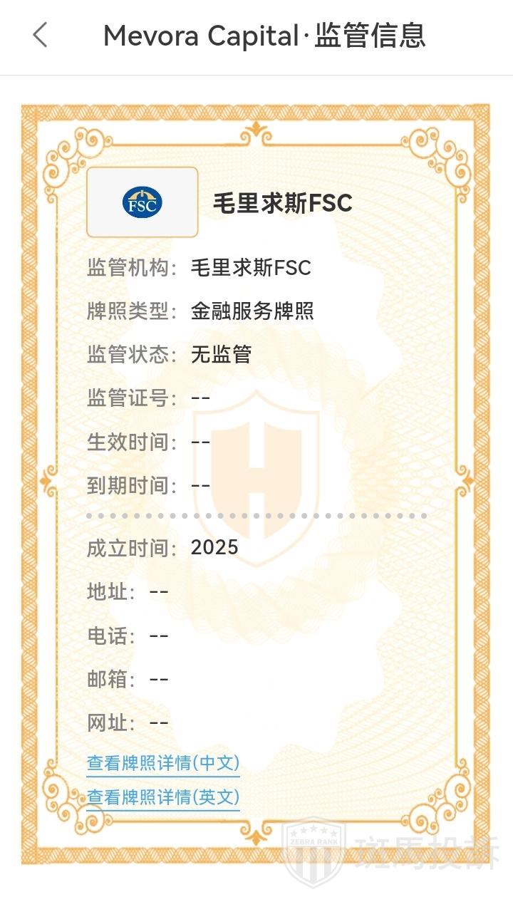 Mevora Capital平台官网称受毛里求斯共和国金融服务委员会 (FSC) 监管,编号为:C220341。经查询,该公司未持有该牌照,这对投资者来说还是有一定潜在风险的,希望投资者能引起警惕。