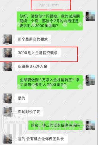 A某表示,第三个月继续做业绩,选择相信公司,结果公司人事给我发了邮件说试用期延期一个月,并在微信跟我约定试用期只要毛入3000美金还是有1000美金的工资,在2025年8月10日本来要发工资的时间,却没有收到工资,去问领导,以业绩不达标的理由回绝。