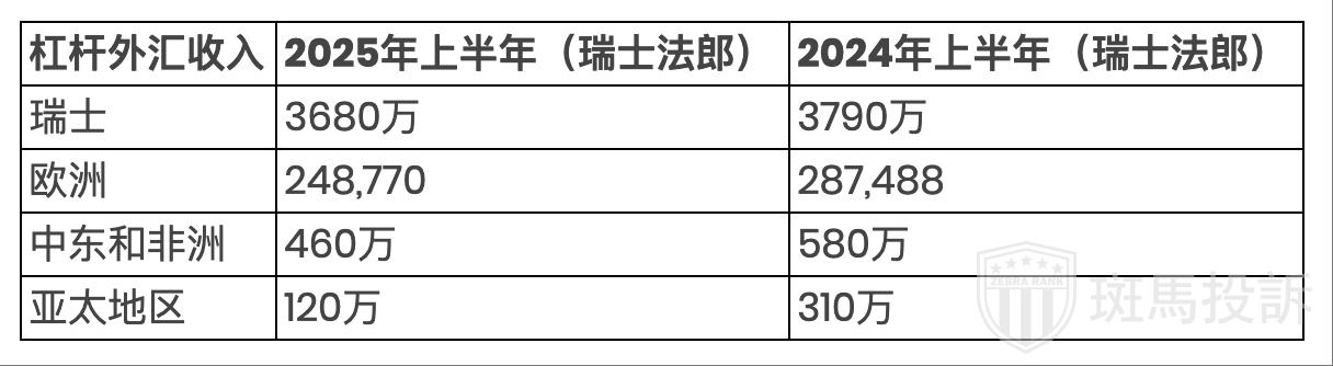 瑞讯银行的经营业绩最先曝光。2025年上半年,该银行来自亚太地区的杠杆外汇交易收入仅为120万瑞士法郎,较去年同期下降了10%以上。尽管如此,杠杆外汇收入在总收入中的份额仍基本保持在12%左右。