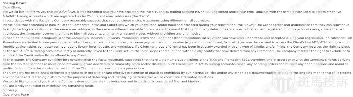 A某表示,随后便联系平台客服,客服称“违规交易”,并且使用不同的电子邮件地址注册了多个账户,但这个账户是我自己独立的IP地址。本人立即要求客服提供具体理由和证据,但客服仅重复平台有权根据条款拒绝出金,无法给出任何实质性解释。