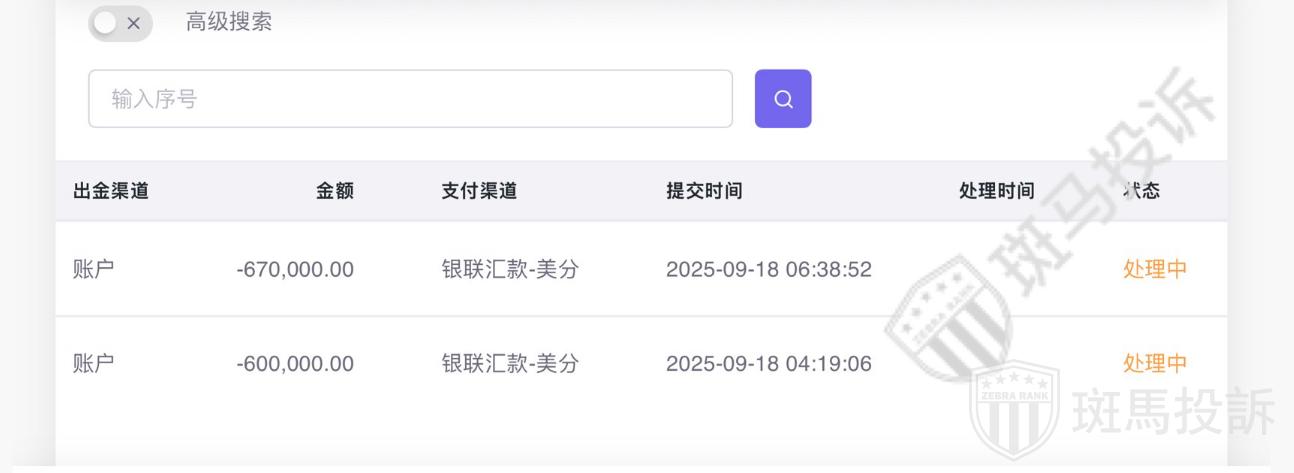 A某表示,于是自己便申请出金,在9月18日申请了2笔约12700美金左右资金出金,时隔一个多星期,该出金申请一直未处理。A某希望平台尽快处理出金申请并到账。