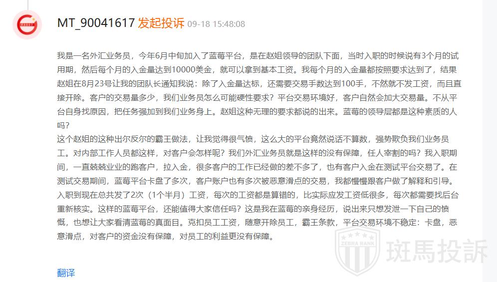 A某称,我入职期间,一直兢兢业业的跑客户,拉入金,很多客户的工作已经做的差不多了,也有客户入金在测试平台交易了。在测试交易期间,平台卡盘了多次,客户账户也有多次被恶意滑点的交易,我都慢慢跟客户做了解释和引导。入职到现在总共发了2次(1个半月)工资,每次的工资都是算错的,比实际应发工资低很多,每次都需要找后台重新核实。A某表示这是其在蓝莓的亲身经历。