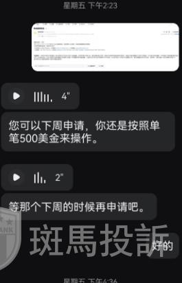 A某表示,在这个情况下,其对账户进行了手动干预,停止了EA,于是自己就收工交易账户,也成功回了一些本金了,回本后就申请出金提现。出金未成功,A某称目前账户还是属于亏损状态,平台以各种为由不让出金,先是说恶意刷单,后面又说是因为套取活动资金。无奈之下,A某表示要报警处理,业务员才说可以500,500这样一笔笔出金。然而申请出金后,还是没有到账。A某希望其平台能够尽快给其资金。