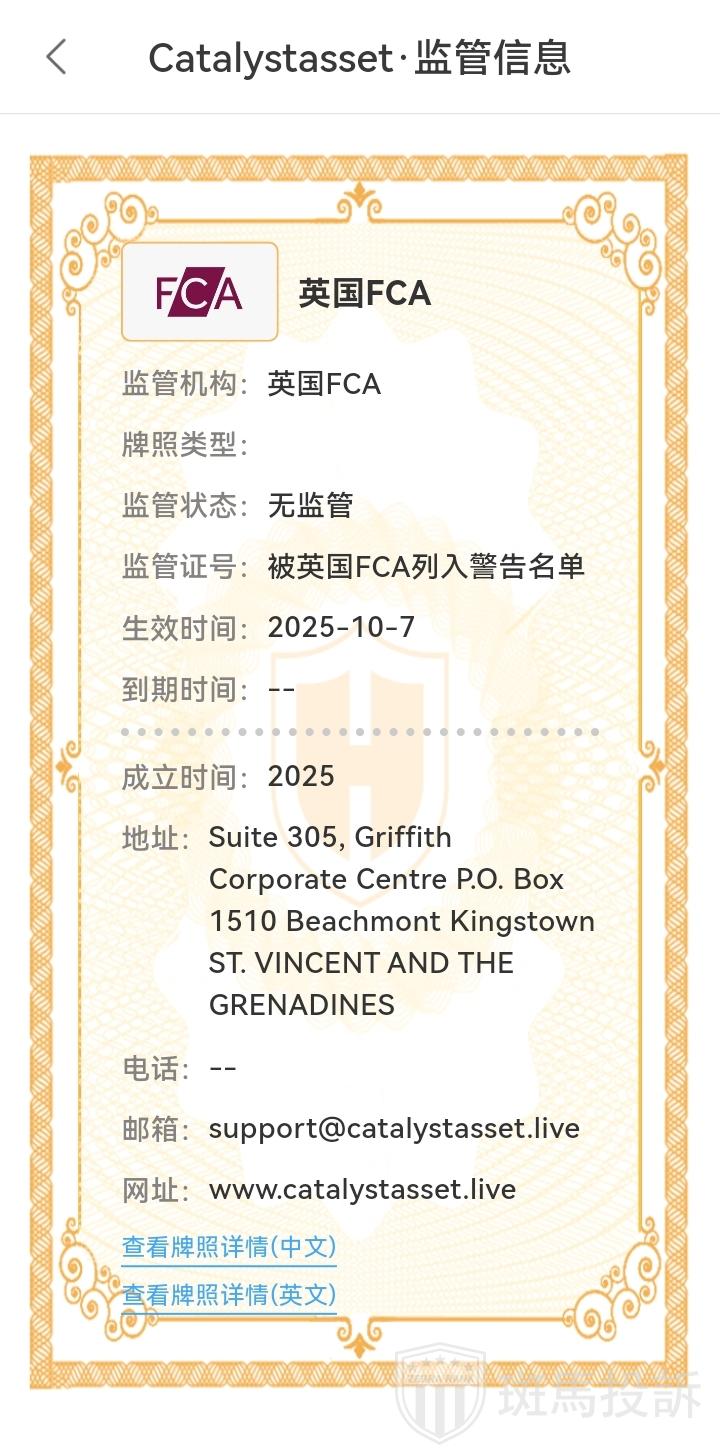这家平台叫Catalystasset,成立于2025年,全球活跃指数6848名,目前无监管,不能做外汇保证金交易,风险扫描显示1条风险,投资者资金安全无保障。