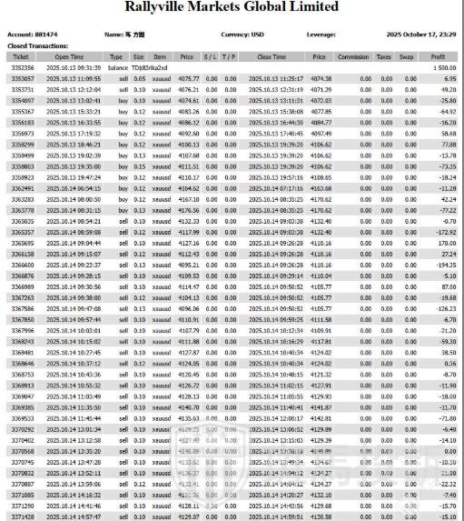 A某表示,本人于10月13日在rallyville markets开立交易账号881474和881531交易方式是趋势交易,每笔订单3-5美金硬止损,只因为最近行情波动太快,指标提示交易的次数非常多,最后有几次加仓的顺势交易赚钱了。