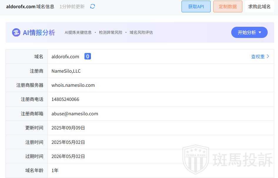 这家平台Aldoro FX,成立于2025年,全球活跃指数排名2330名,目前有1家监管,1张外汇牌照,不能做外汇保证金交易,风险扫描显示1条风险,投资者资金安全有保障。