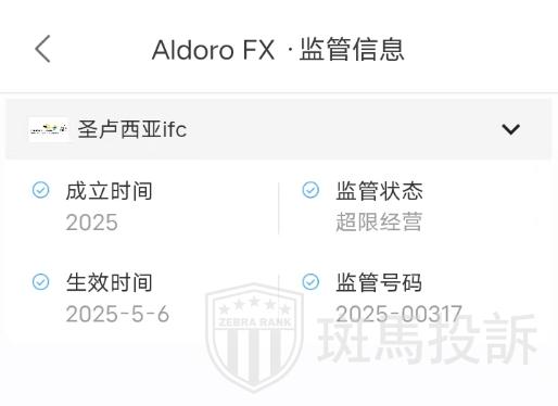 Aldoro FX受圣卢西亚ifc授权并监管,监管证号为2025-00317,Aldoro FX平台属于超限经营,监管相对宽松,对投资者的保护力度较弱,投资者需谨慎选择。