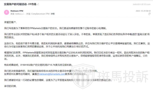 A某表示,交易过程中,发现这期间黄金波动很大,冒着爆仓的风险盈利2715美金,盈利后,A某就在10月29号申请出金。但是这笔出金未到,并等来了澳福平台的邮件,邮件内容称A某是因为“违规交易”,所以需要扣除盈利,于是扣除了。只能出本金。A某表示不理解,具体违反哪条。希望平台重新核查清楚并归还其盈利。