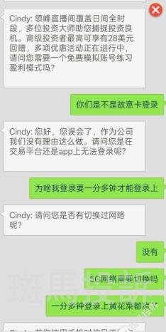 A某表示,自己是领峰贵金属平台的投资者,在该平台开户入金交易的,而交易期间,本人从4月30日在其平台交易黄金白银至今,账号频繁登录不上,不能及时登录账号进行平仓操作。一直亏损。