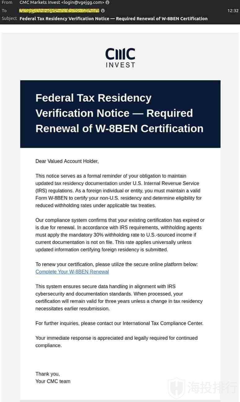 骗子的手段,已经从“粗糙诈骗”迈入“拟真攻击”时代。有投资者收到CMC的邮件,标题写着:“联邦税务居民身份验证通知——W-8BEN PMC认证续期要求”。