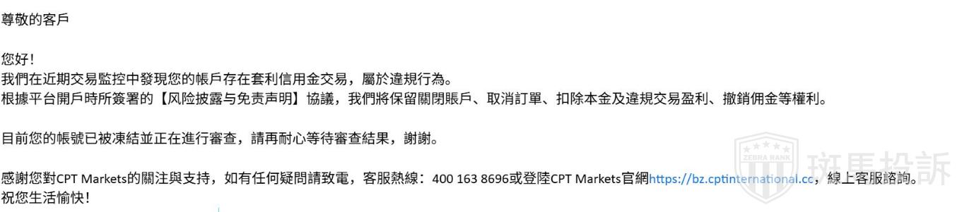 A某表示,账户一直交易四五天这样突然被登录不上交易账号了,后面看邮箱收到CPT告知:我账户套他们的信用金,交易账户被强制关闭,说我的账户违规交易。