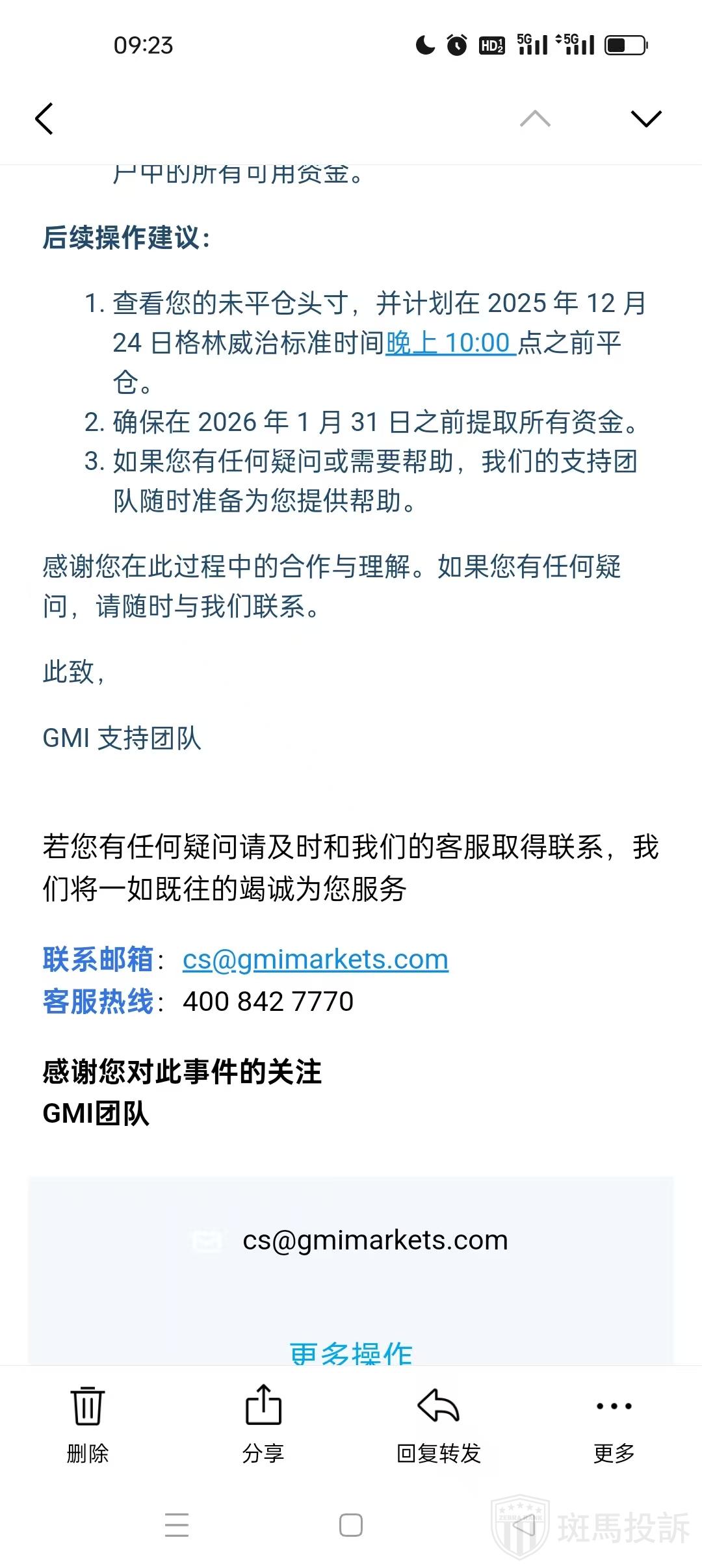 其次,GMI的代理和销售也在各大社社群通知:各位朋友大家晚上好,GMI已决定2025年12月31日关闭全球市场,请各位合作伙伴,通知客户出金,平台会尽快处理客户出金申请,谢谢你多年的信任。