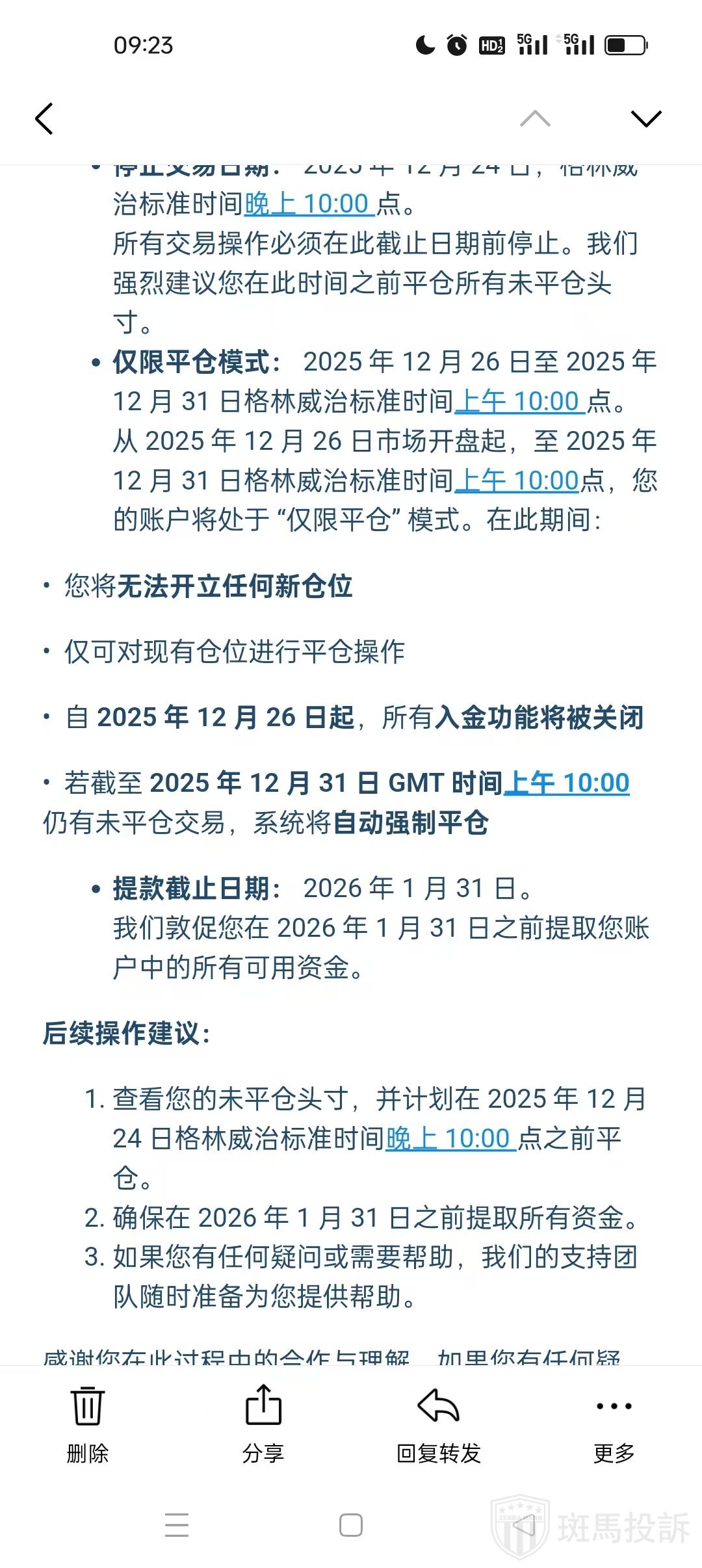 3.资金清算承诺:明确给出了出金的时间表,并承诺保障客户拿回资金。对于一个即将关闭的公司来说,处理完所有客户的资金清算才是最体面的收尾。