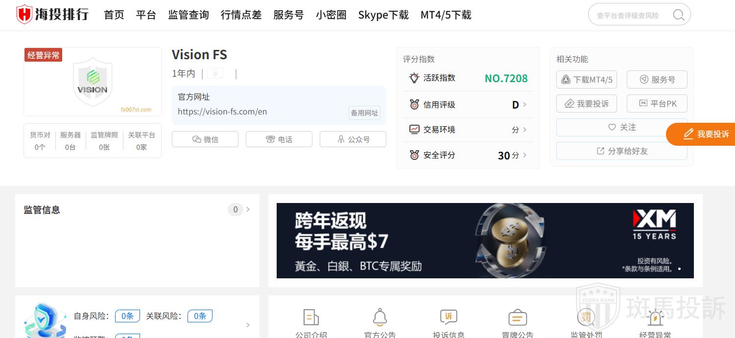 Vision FS平台在斑马投诉暂未收到投诉信息。