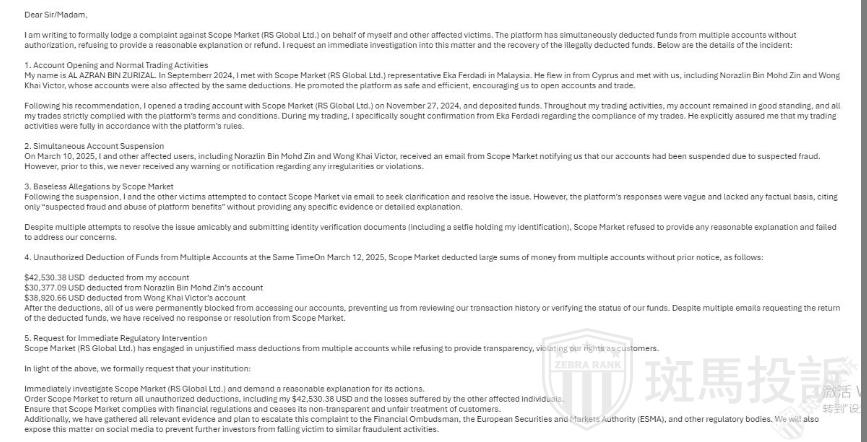 针对上述投诉,斑马投诉已第一时间将相关信息反馈至斯科普(Scope Markets)平台,截至发稿时,我们尚未收到斯科普平台的正式回应。我们将保持持续联系,敦促平台提供官方解释和相关证据,促进问题得到公正解决。