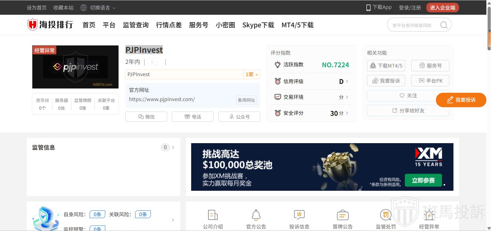 这家平台叫PJPInvest,成立于2024年,全球活跃指数7224名,目前没有监管,没有外汇牌照,不能做外汇保证金交易,风险扫描显示3条风险,投资者资金安全无保障。