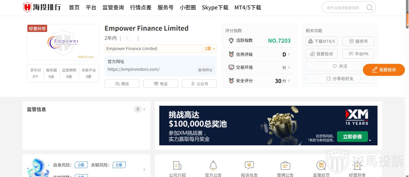 Empower Finance Limited平台目前在斑马投诉未收到相关投诉。