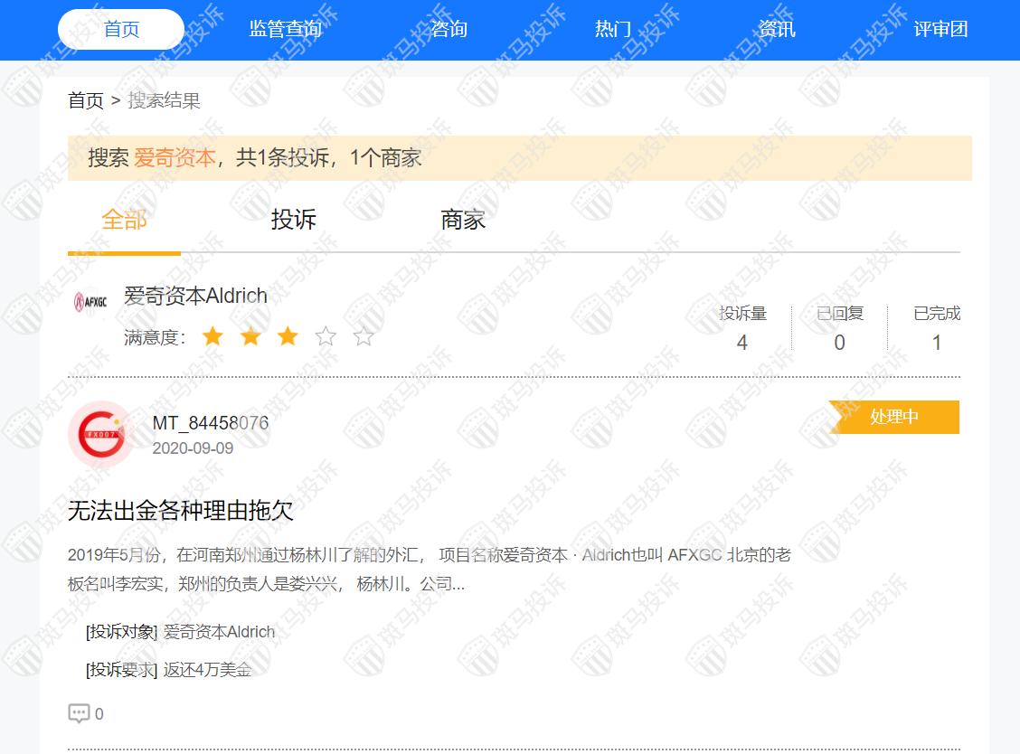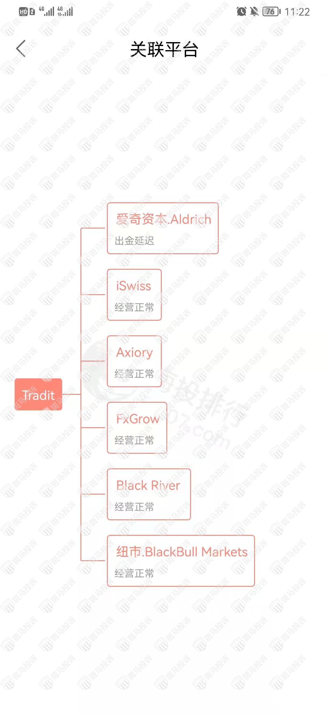 Tradit的关联平台爱奇资本Aldrich平台在斑马投诉已收到4条投诉,其中3条仍在处理中,1条已完成。