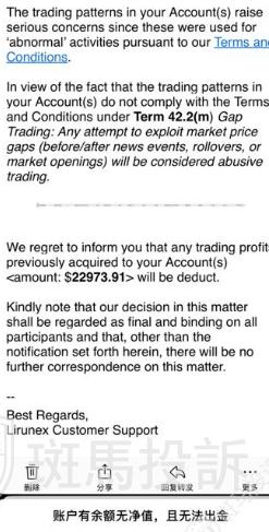 A某表示,自己在该平台交易,于周一盈利后提交出金,然而到周四晚间未到账,这时,平台周四晚间来一个“重要通知”邮件,声称我利用价格跳空获利,扣除我22973.91美元盈利。