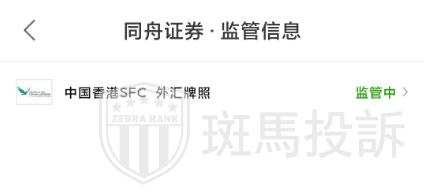 同舟证券外汇平台受中国香港SFC授权并监管,监管证号为 AJD535,香港SFC属正规外汇牌照,但市场有风险投资者需谨慎选择。