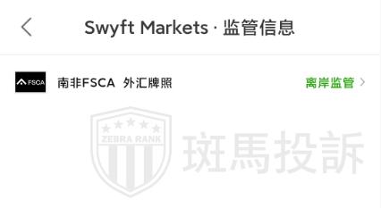 Swyft Markets外汇平台受 南非FSCA授权并监管,监管证号为2023/673950/07,市场有风险,投资者需谨慎选择。