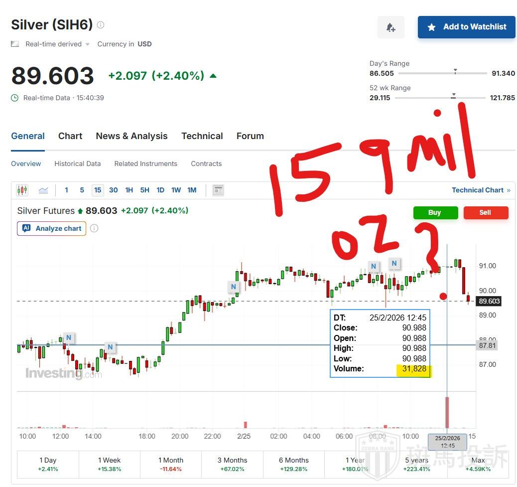 就在这次所谓的“技术故障”发生前后,有交易者发现了一个无法忽视的时间节点——短短15分钟,31,828份白银期货合约,折合1.591亿盎司白银被集中性抛售,目标价位正是91美元阻力位。