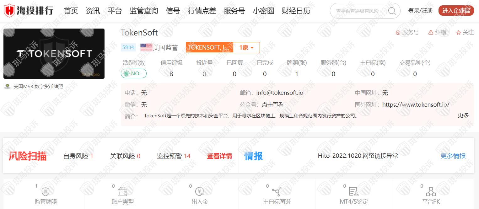 TokenSoft平台成立于2017年,风险扫描显示14条风险,投资者需注意其风险提示信息。