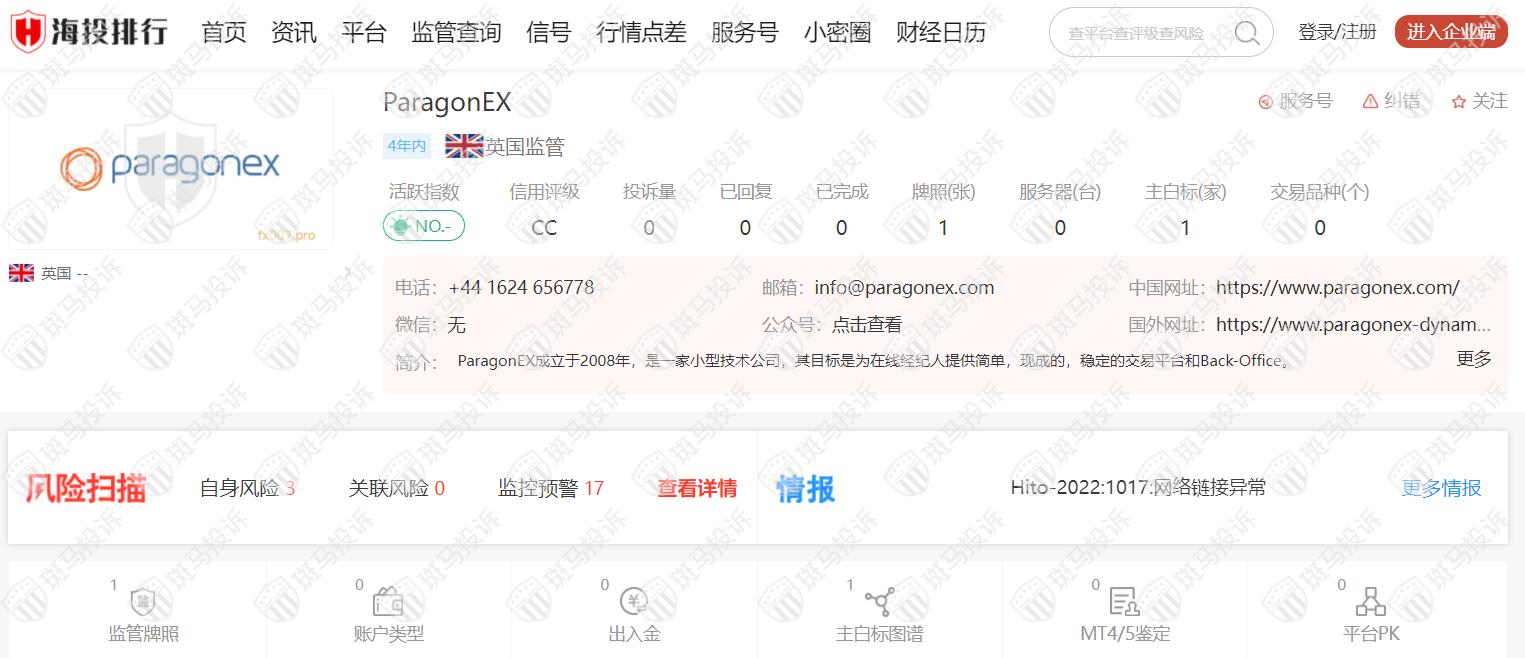 ParagonEX平台成立于2018年,风险扫描显示17条风险,投资者需注意其风险提示信息。