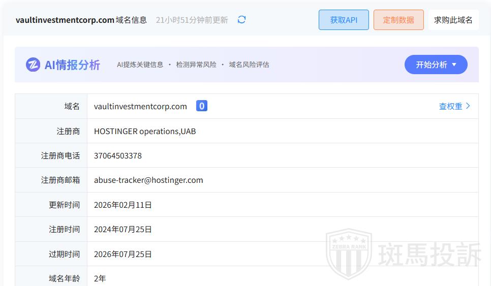 这家平台叫Vaults Investment,成立于2025年,目前有0家监管,0张外汇牌照,不能做外汇保证金交易,风险扫描显示4条风险,投资者资金安全有保障。