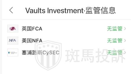 Vaults Investment外汇平台受英国FCA、美国NFA、塞浦路斯CySEC授权并监管,但是经过我们的查找并未发现相关监管信息,该平台全球排名6408名,市场有风险,投资者仍需谨慎选择。
